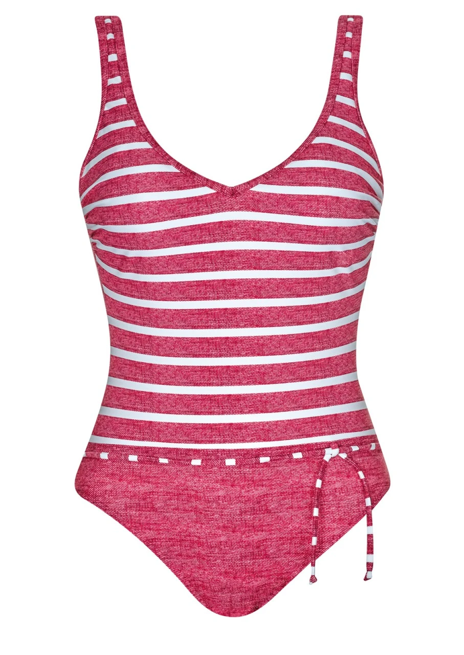 Querstreifen in Weiß und in sich gemustertem Rot – das ist das Design der Serie RED BLISS. Badeanzug mit V-Ausschnitt, Softschalen und einem tiefen Rückenausschnitt. Süßes Detail: Das gestreifte Spaghettiband um die Taille.