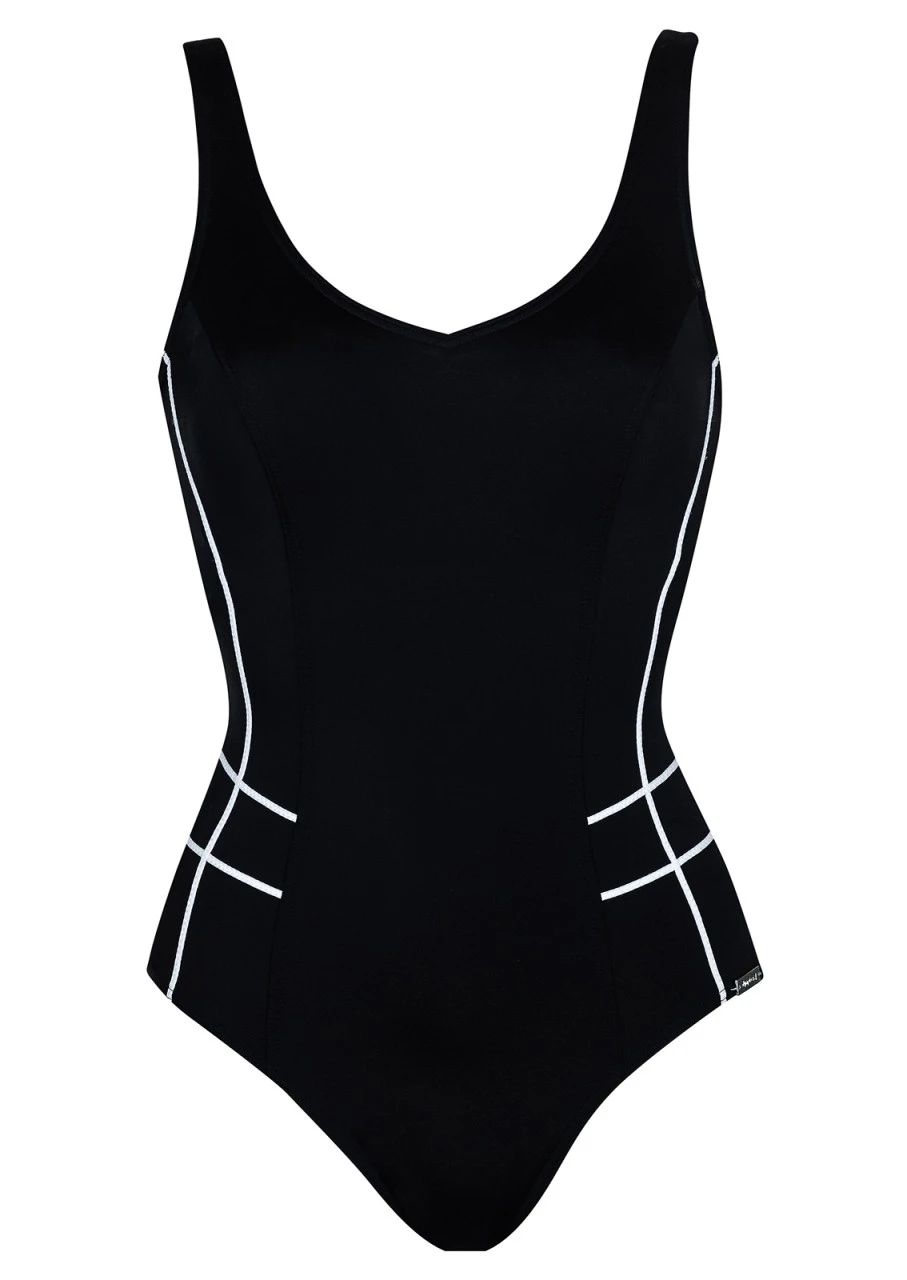 Perfekt für Schwimmerinnen – sportlicher Badeanzug in zeitlos, schönem Design. Der optimale Halt wird durch eingearbeitete Softschalen gewährleistet. Der leichte V-Ausschnitt setzt feminine Akzente und die kontrastfarbenen Applikationen rücken die Figur ins rechte Licht. Der Einteiler ist aus einem speziellen chlorresistenten Material gearbeitet, das selbst hoher Beanspruchung trotzt und der Trägerin lange Freude bereitet. Zudem bietet es hervorragende Trageeigenschaften und kürzeste Trocknungszeiten.