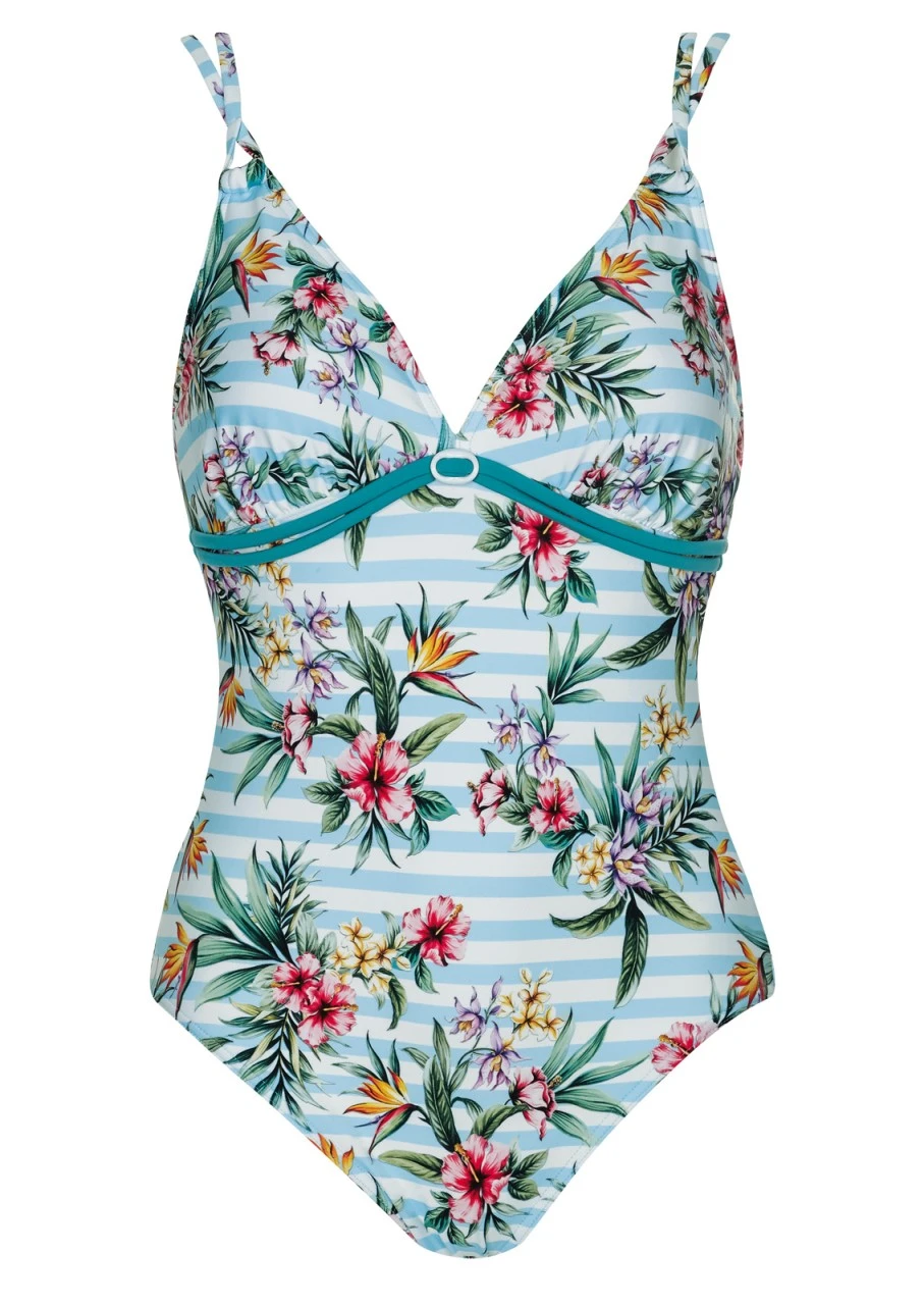 Ein frisches Streifenmuster in Weiß und Hellblau kombiniert mit einem verspielten Blütendruck zeichnet die junge Serie „TROPICAL DREAM“ aus. Badeanzug mit Softschalen und hohem Rückenausschnitt. Die Doppelträger sind verstellbar und aushakbar. Das unterhalb der Brust verlaufende kontrastfarbige Zierband mit Zierring in der Mitte verleiht dem Einteiler eine jugendliche Lockerheit.