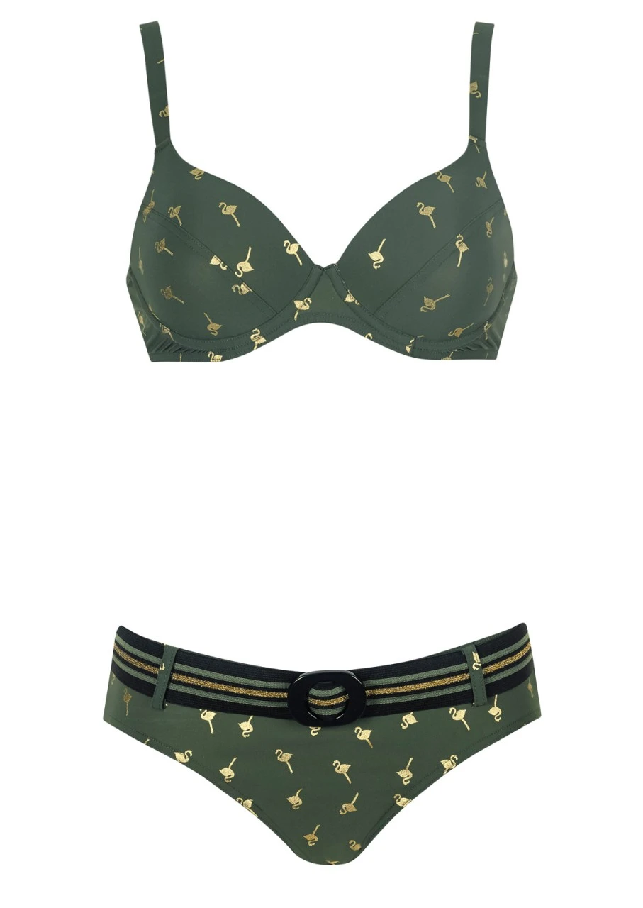 Ein unwiderstehliches Dunkelgrün mit goldenem Flamingo-Druck. Bikini mit Softschalen und Formbügel. Die Träger sind aushakbar und verstellbar. Der Slip ist mit einem gestreiften Gürtel mit schwarzer Schnalle verziert.
