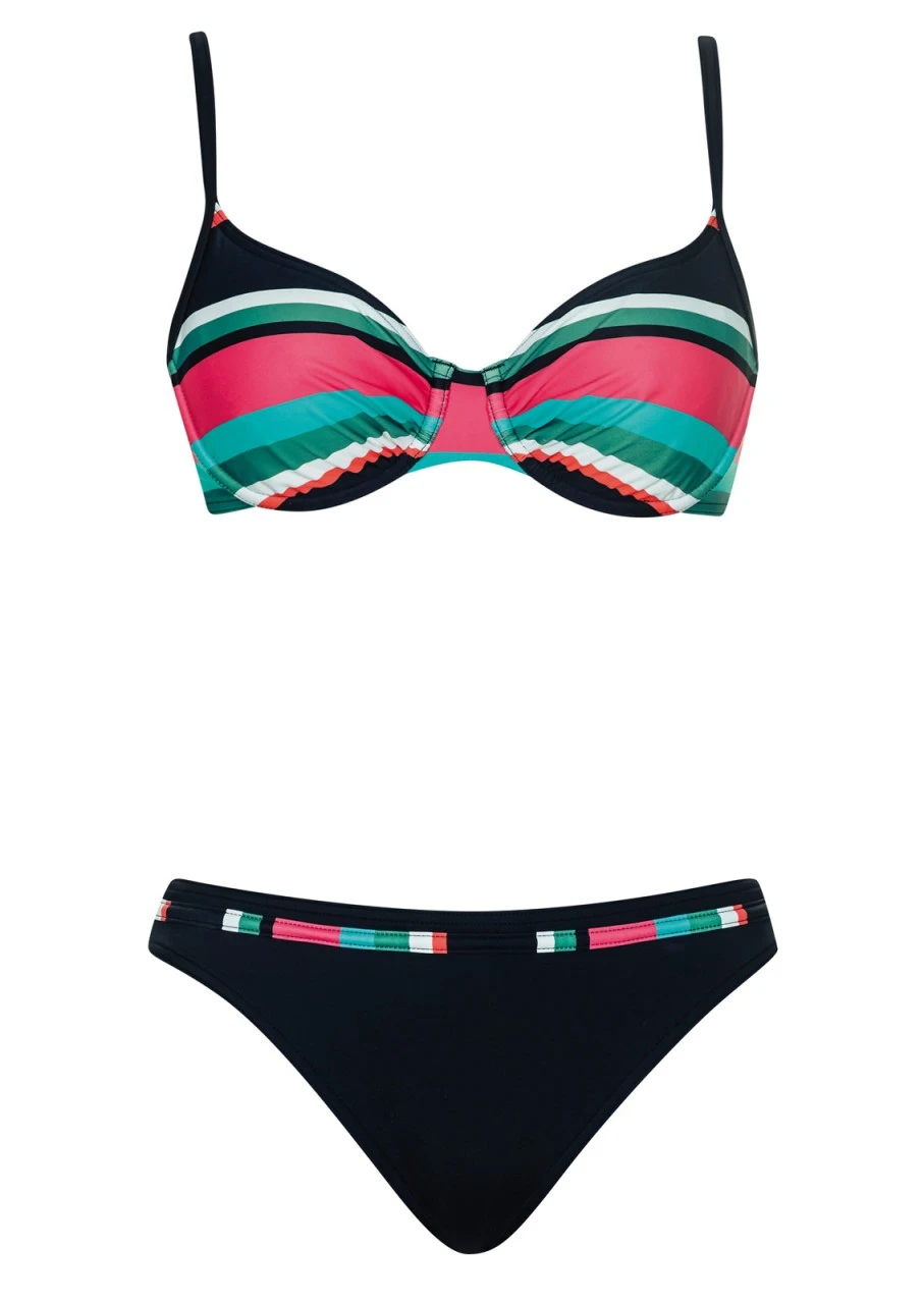 Knallige Farben! Frisches Design mit unterschiedlich breiten Querstreifen – so strahlend wie der Sommer. Bikini mit Formbügel und Petticoatstütze. Die Träger sind verstellbar. Schwarzer, schmal geschnittener Slip mit Zierblende im Design der Serie.