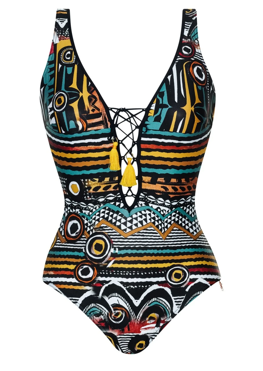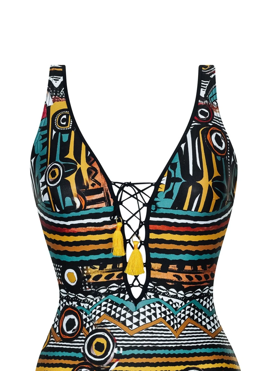 Viva la Africa ist angesagt. Das Muster im Afro-Stil ergänzt sich nahezu perfekt mit dem Schwarz. Ein Gemisch aus Erdtönen, Türkis mit einem Hauch von Weiß. Badeanzug mit Softschalen und verstellbaren Trägern zum Aushaken. Extravagantes tiefes Dekolleté, das mit Bändern gehalten wird.