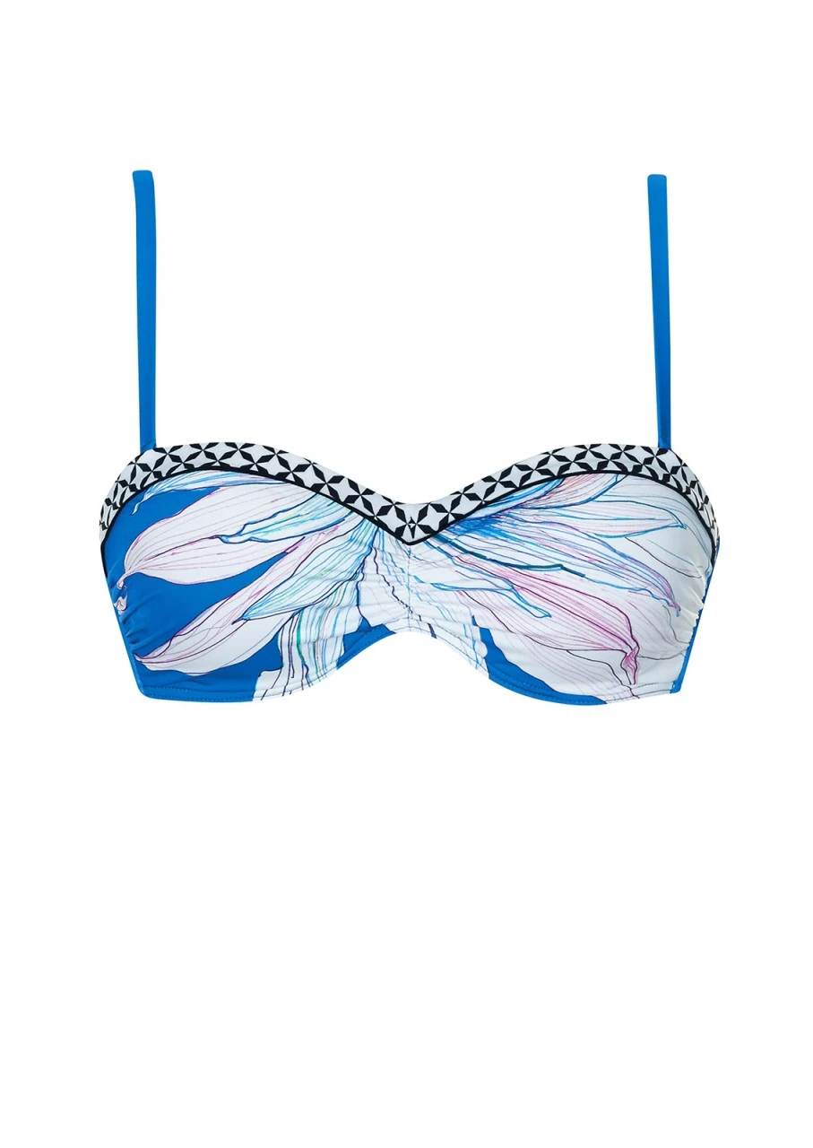 Auffallendes Farbspiel zwischen Weiß und einem tiefen Blau! Hervorragende Blumen im Einklang mit einem Hauch von Rosa. Bikini mit Innenbügel, Softschalen und verstellbaren Schulterträgern zum Abnehmen.