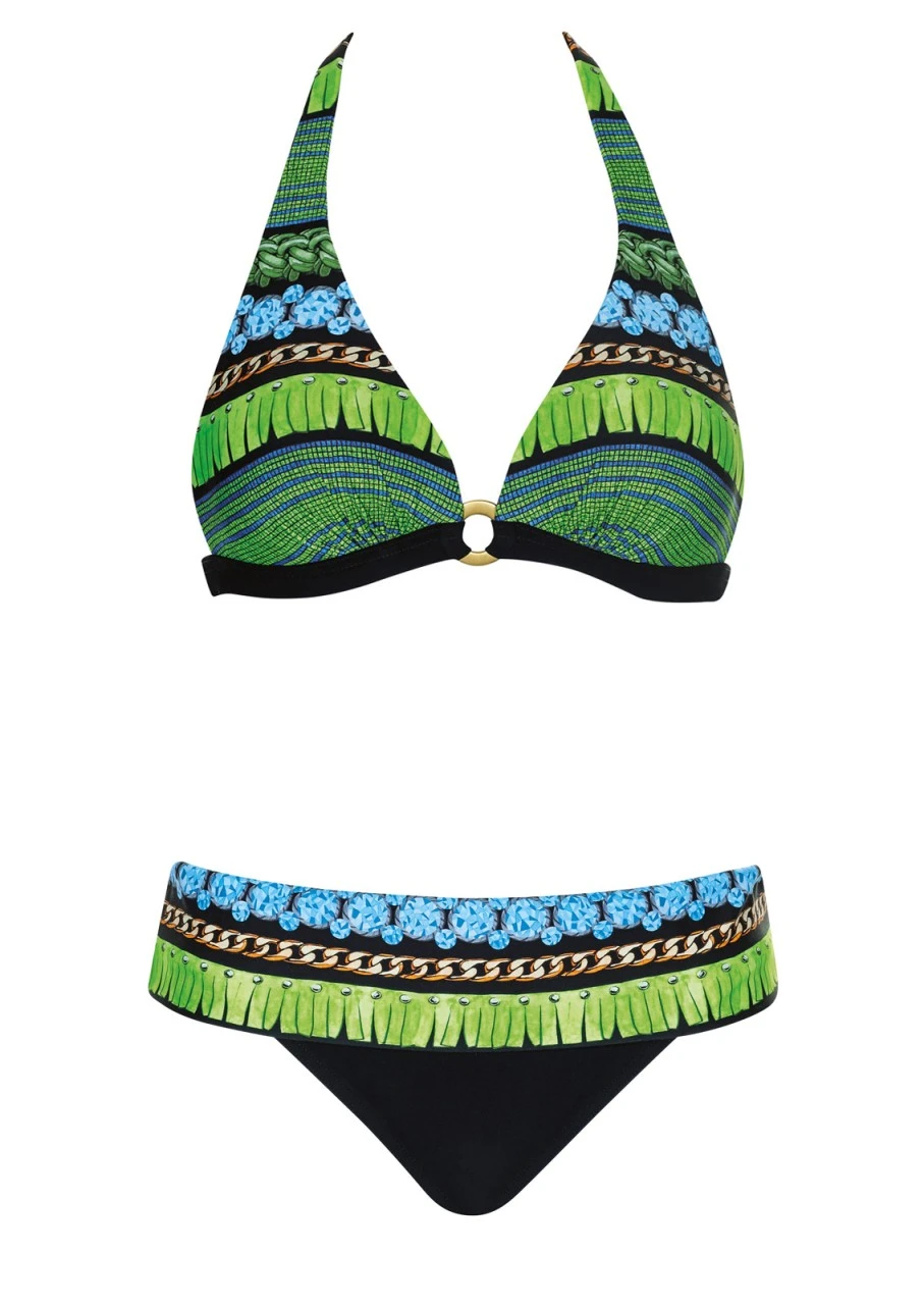 Edelstes Schwarz, darauf ein luxuriöser Print von Fransen, Edelsteinen, Karos und Ketten. Eine junge, stilvolle Serie. Triangel-Bikini mit Softschalen. Damit beim Liegen nichts stört, ist der Bikini am Rücken mit einem Verschluss zu schließen und im Nacken zu binden. Süßes Detail: Das Top ist mit einem goldfarbenen Ring verbunden. Schwarzer Slip mit Umschlagbund im Design der Serie. Durch den breiten Bund kann die Hose variabel getragen werden: bauchkaschierend, mit nach oben geklapptem Bund oder sexy mit nach unten geklapptem Bund.