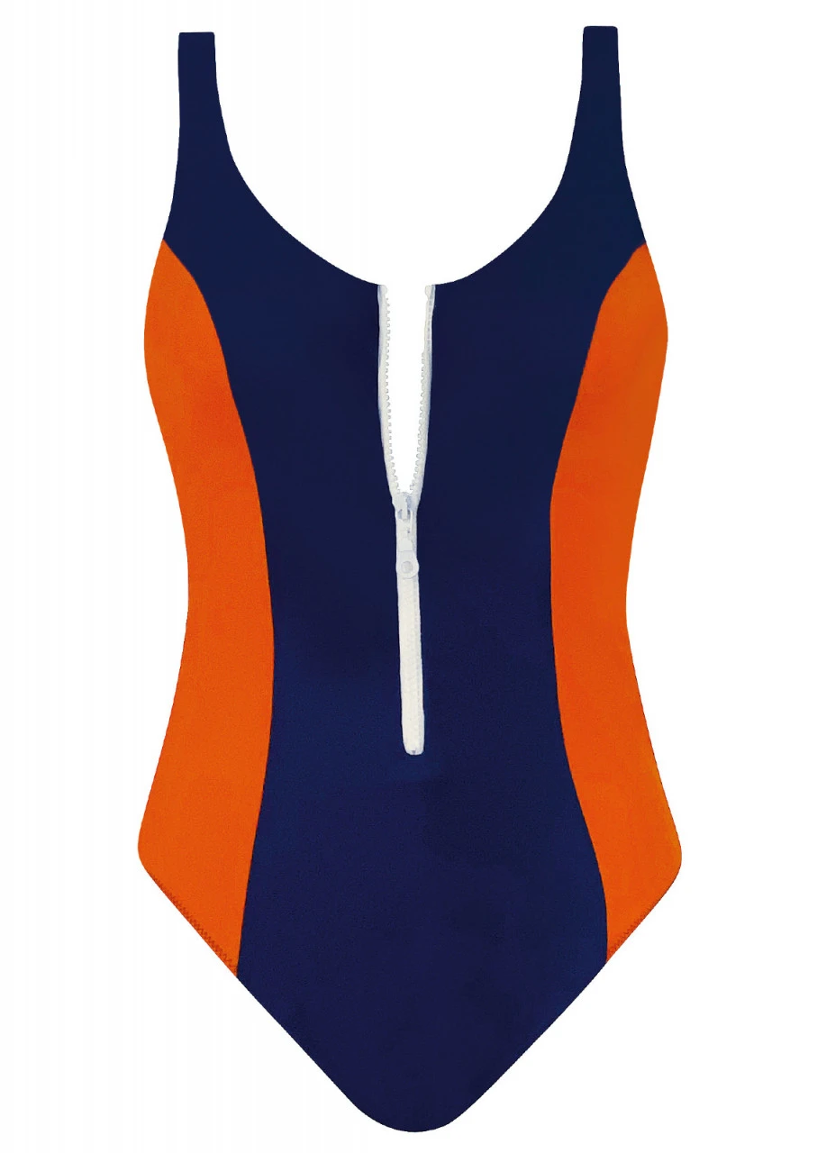 Ein absoluter Blickfang! Schönes Nachtblau kombiniert mit leuchtendem Orange. Badeanzug mit eingearbeiteten Softschalen und Reißverschluss in der Farbe Weiß. Die Rückseite des Einteilers ist in der Farbe Nachtblau und hat einen tiefen Rückenausschnitt. Nachhaltige Bademode: OLYMPIA® GOES NEXT LEVEL – Bademode aus recyceltem Material.