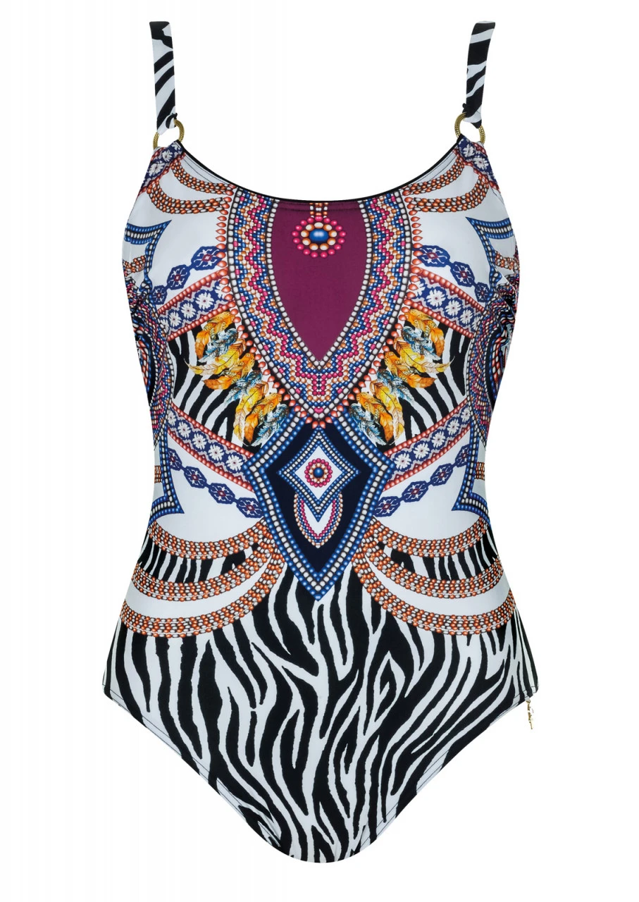 Ein atemberaubender Druck: Zebra-Muster kombiniert mit Federn und Ketten. Und alles zusammen ergibt eine harmonische sowie geniale Komposition. Badeanzug mit Formbügel. Die Träger sind verstellbar und mit goldfarbenen Zierringen versehen. Tiefer Rückenausschnitt. Der Badeanzug ist mit Futter unterlegt.