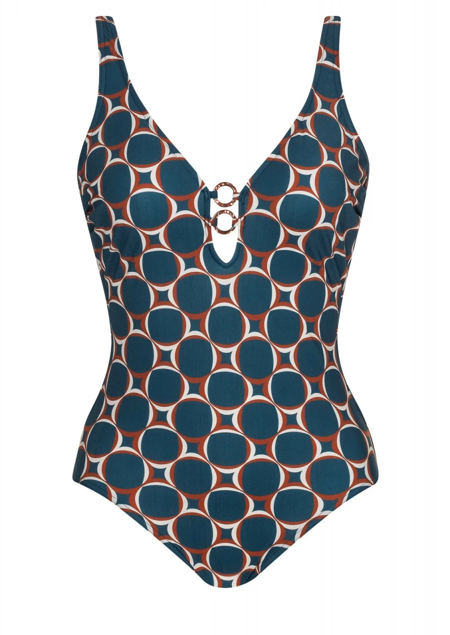Spektakuläres Retro-Design! Stylischer Grafikprint in Blau, Hellbraun und Beige inspiriert durch die 70er Jahre. Badeanzug mit Softschalen und einem tiefen Rückenausschnitt. Die Träger sind verstellbar. Das schöne, etwas tiefer ausgeschnittene Dekolleté wird mit Zierringen gehalten. Der Badeanzug ist komplett mit Futter unterlegt.