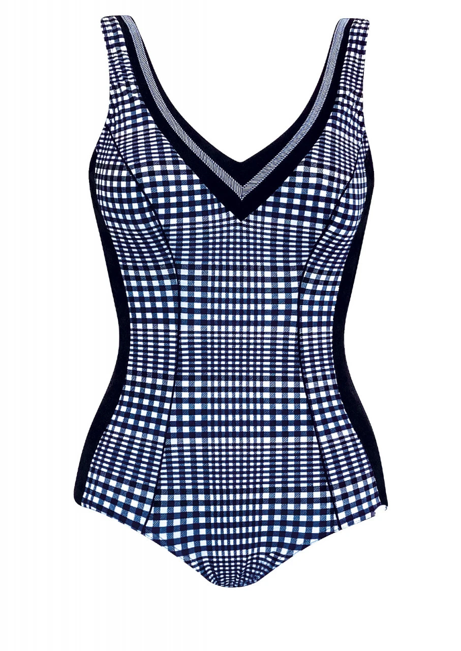 Karo goes Beach. Stylisches Karodesign in Schwarz, Dunkelblau und Weiß – für einen modischen Auftritt am und im Wasser. Badeanzug mit Softschalen und stützender sowie formender Halbcorsage. Wiener Nähte zieren, für eine figurbetonende und taillierte Optik, die Vorderseite. Die Blenden an der Vorderseite und die Rückseite sind in Uni Schwarz gehalten. Tiefer Rückenausschnitt.