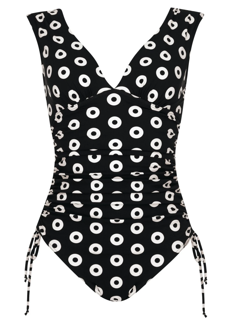 Modisches Design in Schwarz/Weiß. Scheinbar schwebende Kreise zaubern eine faszinierende Optik. Badeanzug mit Softschalen, schönem V-Ausschnitt und einem hohen Rückenausschnitt. Die extra breiten Träger sorgen für einen angenehmen Tragekomfort. Durch die Raffungen an der Vorderseite ist der Badeanzug besonders trage- und figurfreundlich. Tolles Extra: Der Beinausschnitt kann mit einem seitlichen Kordelzug reguliert werden. Der Badeanzug ist komplett gefüttert. Durch diese Vollfütterung garantiert der Einteiler zusätzlichen Halt und ist besonders blickdicht.