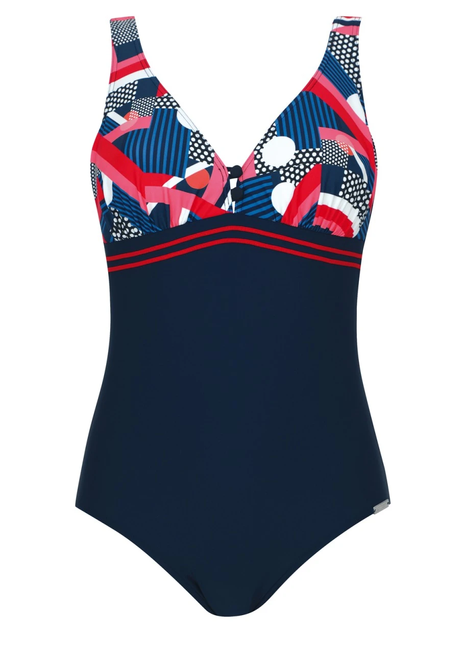 Kreative Kombination aus Farbe – Streifen – Punkte. Aus diesen drei Elementen ist ein sensationelles Grafikdesign entstanden: Top-modisch, auffallend und dennoch in Dessin und Schnitt für jede Frau gut tragbar. Badeanzug mit Softstütze, diese Halbstütze im Büstenteil stützt und formt die Brust auf sanfte Art und Weise. Der Einteiler ist im oberen Teil bedruckt, im unteren Bereich Uni Nachtblau. Schöner Eyecatcher sind die beiden süßen Knöpfe am Dekolleté und die dekorativen Zierbänder unter der Brust, die dem Einteiler einen femininen Look verleihen. Die Rückseite des Einteilers ist in der Farbe Nachtblau und hat einen tiefen Rückenausschnitt.