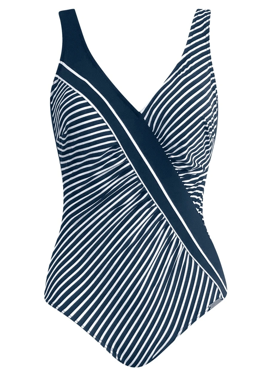 Schiff ahoi! Klassisches maritimes Design mit blau/weißen Diagonalstreifen. Badeanzug mit Softschalen. Der Einsatz mit diagonalen Linien lockert das Design auf und streckt optisch die Figur. Der Einteiler ist durch die leichten Raffungen an der Vorderseite besonders trage- und figurfreundlich. Die Vorderseite ist mit Futter unterlegt. Die Rückseite des Einteilers ist in der Farbe Nachtblau gehalten und hat einen tiefen Rückenausschnitt.