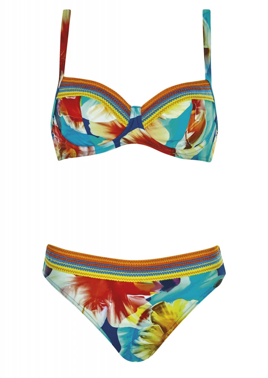 Wie ein Aquarell auf Ihrer Haut. Tolle Farben, dominiert von Türkis und sommerlichen Gelb und Orange. Blütendrucke in Aquarelloptik. Bikini mit Formbügel und Futterstütze. Die Träger sind verstellbar. Tolles Detail: Gestreiftes, farbenfrohes Ziergummiband in Weboptik am Dekolleté und Slip.