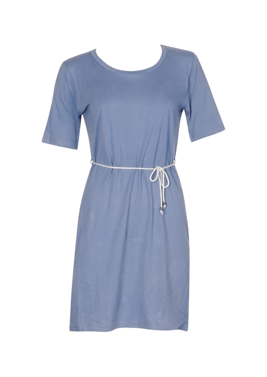 Unifarbenes T-Shirt-Kleid in Hellblau. Midi-Kleid mit kurzen Armen und Rundhalsausschnitt. Die Kordel zum Binden betont die Taille und verleiht dem Kleid einen maritimen Touch. Ein unkompliziertes Kleid, mit denen Sie am Strand eine ebenso gute Figur machen wie im Café, im Restaurant oder beim Stadtbummel. Pflegeleicht und angenehm zu tragen – aus 100 % Baumwolle.