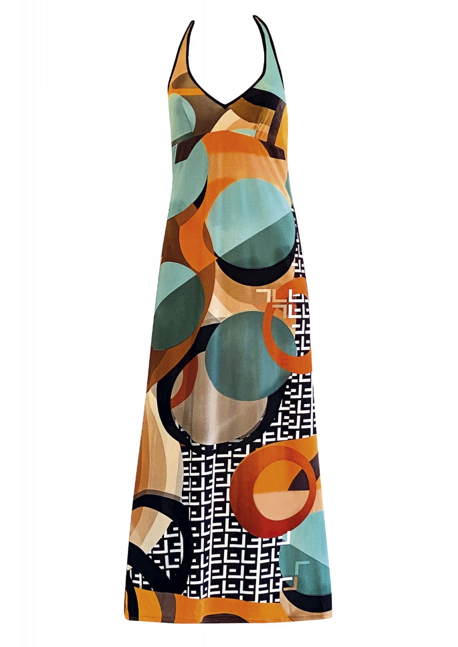 Fantasievoller Grafikprint im Retro-Look. Neckholder-Kleid mit V-Ausschnitt. Das Maxikleid ist das stylisches Cover-up für den Strand oder Badesee und kann ebenso beim Stadtbummel, an der Poolbar oder bei einer Beachparty getragen werden.
