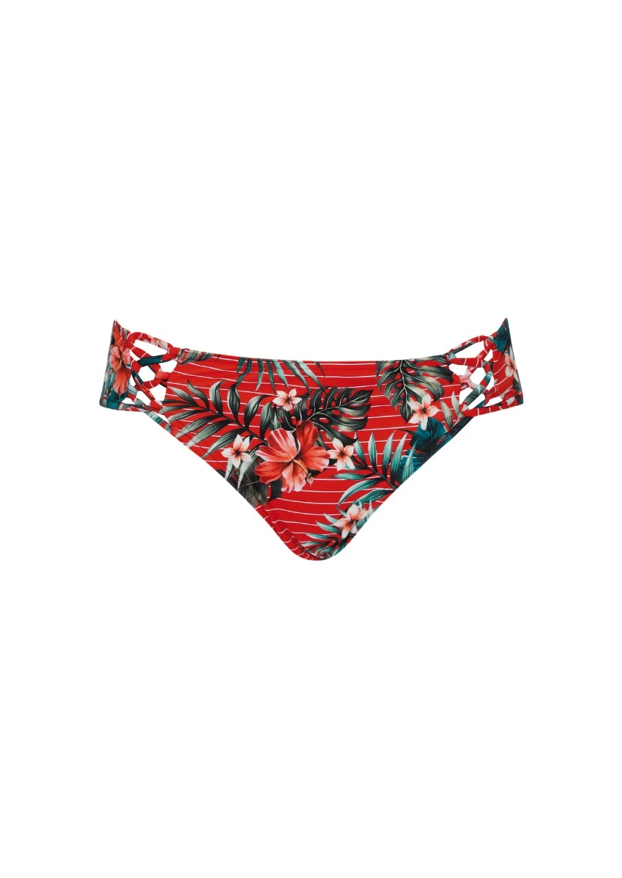 Süße Kombination aus frechen rot-weißen Querstreifen und Hawaii-Print mit Palmblättern und Hibiskusblüten. Ein traumhaft schönes Design für Badenixen, Sonnenanbeterinnen und Urlaubsfans. Verführerischer Bikini-Slip mit überkreuzten Bändchen in raffinierter Schnüroptik an den Seiten. Diese wunderschöne Hüfthose wartet auf das Oberteil Ihrer Wahl. Nachhaltige Bademode: OLYMPIA® GOES NEXT LEVEL – das Polyamid für den Oberstoff ist zu 100 % aus recycelten Fasern.