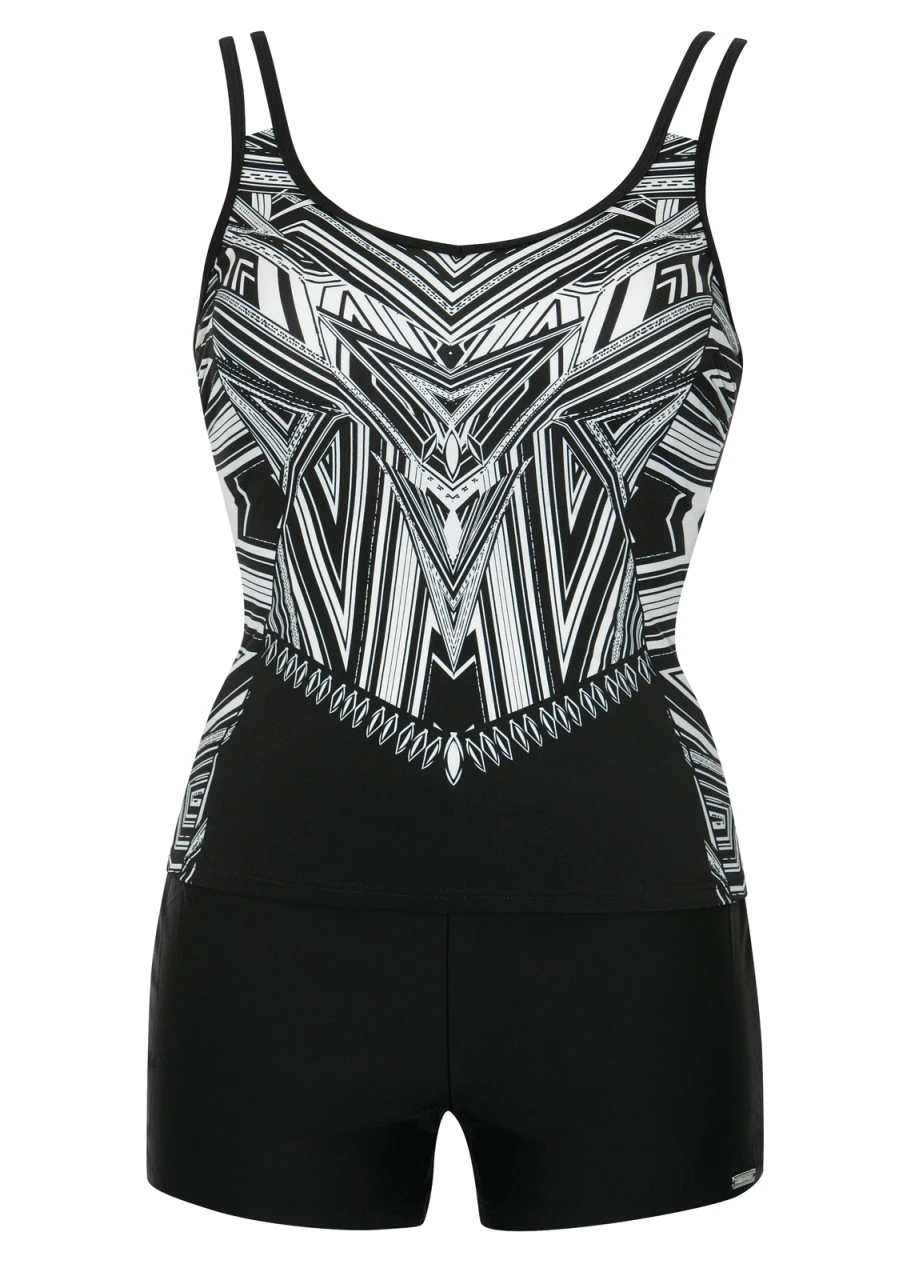Schickes Grafikdesign in Schwarz/Weiß! Tankini mit Softschalen. Die feinen, doppelten Träger sind verstellbar und am Rücken zum Aushaken, somit können die Träger auch im Nacken gebunden werden. Dank des raffinierten Dessins unterstützt der Zweiteiler optisch die Figur. Eine Hotpants vervollständigt das Tankini-Set. Die Rückseite des Oberteils und die Hotpants sind in der Farbe Schwarz.