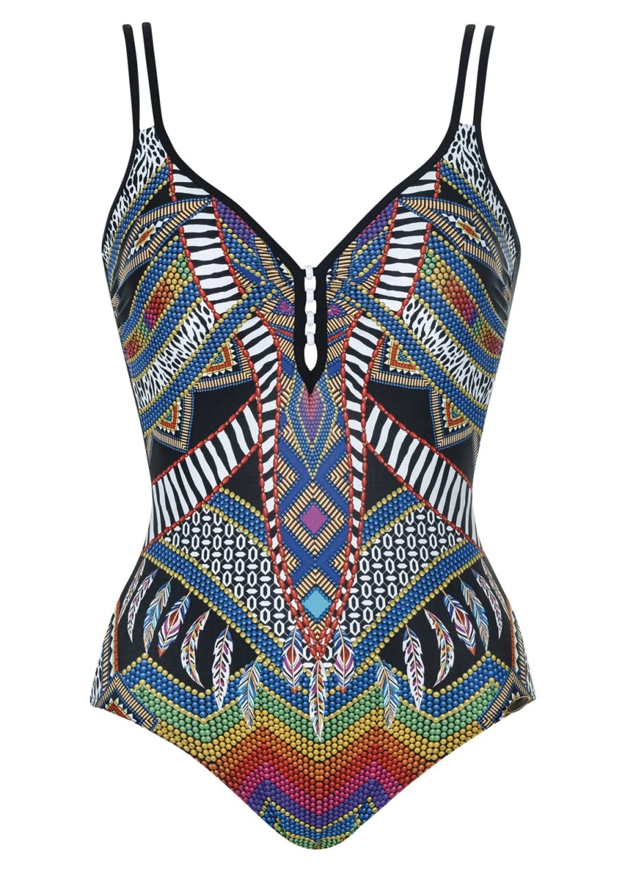 Traumhaftes Ethno-Muster in satten Farben auf schwarzem Grund – das ist unser Serie PEALY FUN. Badeanzug mit Softschalen. Niedliche Doppelträger in Schwarz. Das Dekolleté ist sexy, aber nicht zu offenherzig. Die Rückseite des Einteilers ist in der Farbe Schwarz. Gleicher Artikel wie Art. Nr. 59-72184-1 jedoch komplett gefüttert. Durch diese Vollfütterung garantiert der Einteiler zusätzlichen Halt und ist besonders blickdicht.