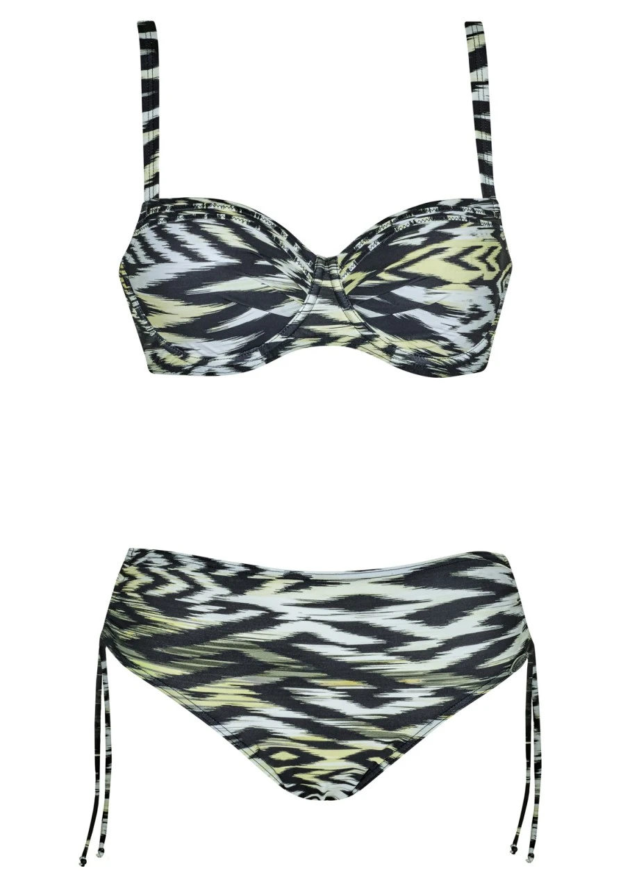 Die pure Verlockung! Schwarzer Hintergrund mit verwischtem Karo und Zickzack-Muster in Weiß, Hellgelb und Dunkelgrün. Ein geniales Design voller Leichtigkeit. Bikini mit Softschalen und Formbügel. Die Träger sind verstellbar und am Rücken zum Aushaken. Der Bikinislip ist durch die seitlichen Bänder in der Höhe zu verstellen.