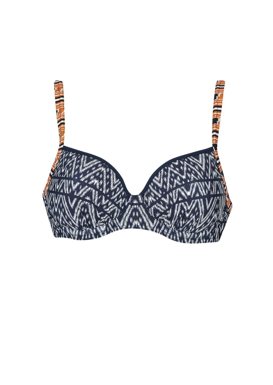 Batik goes Beach. Sehr süßes Design in Nachtblau mit weißem Zick-Zackmuster. Der Druck wirkt leicht verwaschen, dadurch entsteht eine Batik-Jeans-Optik. Süßes Bikini-Top mit Formbügel, Softschalen und verstellbaren sowie aushakbaren Trägern. Sehr komfortabler, leichter und schnell trocknender Spacer-Cup!